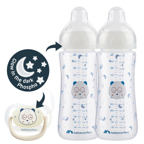 Två självlysande ringar på flaskorna underlättar nattmatningen och guidar dig även i svagt ljus. Den självlysande nappen är lätt att hitta i mörkret.