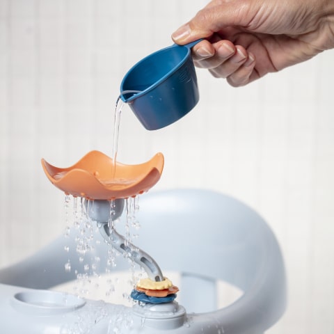 Med en fiskmugg, solformat vattenhjul, sjöstjärnesil och snäckformade ringar håller aktivitetsbrickan ditt lilla barn engagerat och underhållet under varje badstund.